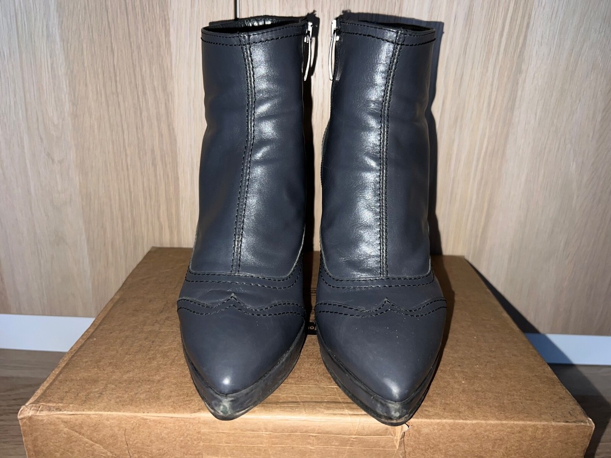 Diese stilvollen Stiefeletten mit spitzer Spitze, dünnem Absatz und kleinem Plateau verleihen jedem Outfit einen eleganten Touch. In einem vielseitigen Grauton mit Navy-Akzenten gehalten, sind sie ideal für nachhaltige Mode, da sie Second-Hand sind. Kombiniere sie mit Jeans oder einem Kleid für einen gepflegten Look.