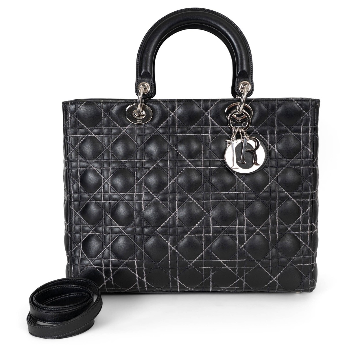 bag is exquisitely crafted in black Cannage quilted lambskin leather with gradient grey wavy topstitching that lends a modern twist to the house’s timeless design. It features structured top handles and a removable shoulder strap, both accented with polished silver-tone hardware. The signature “D.I.O.R.” charm adds a touch of elegance, while the top zipper opens to a Dior Oblique nylon-lined interior with a zipper pocket against the back—an icon of sophistication and Parisian allure. Has been carried and is in excellent condition. Comes with dust bag. MeasurementsHeight25cm (9.8in)Width31cm (12.1in)Depth10cm (3.9in)Drop of the Handle10cm (3.9in)Shoulder Strap Length90cm (35.1in)HardwareSilver-ToneShopZurich - RämistrasseAll our listings include only the listed item unless otherwise specified in the description above - Price includes US tariffs - for all other countries price does not include import duties & taxes - check your countries import laws prior purchase------------------------------------------------------------------------------------------------------------------------------------------ Terms & Conditions Luxury-Shops is not affiliated with any of the name-brand items we offer for sale.Warranties and Liabilites: Luxury-Shops declines all responsibility and cannot be held liable for any damages caused by the use of a specific garment.We also cannot be held responsible for the quality of an item (we are not the manufacturer) or any damages resulting from a manufacturing defect.No warranties of any kind are given or implied.Condition of Merchandise: Luxury-Shops offers for sale luxury top-quality products. We fully disclose the condition of each item. In the description of each product, Luxury-Shops will specify the conditions if different from the standards set by the market (Required disclosure of prior use)The main characteristics of products are shown in great detail (through numerous photographs and in-depth descriptions). The products offered for sale MAY NOT correspond to the real garments in terms of image and color because of the Internet Browser or Monitor used (color calibration). Luxury-Shops disclaims all responsibility.Every used item offered by Luxury-Shops has been cleaned and restored to the best possible condition unless noted otherwise. Every used or vintage handbag has been polished and refinished. Your purchases will be sent to you ready to be used or worn.Please be aware that vintage items may be delicate and may not be as resilient as a brand-new item. Please take appropriate care when using a vintage item. Damage to items after receipt or use by customers is not the responsibility of Luxury-Shops.Luxury-Shops is a reseller of authentic designer and vintage merchandise. We are not an authorised dealer and are not affiliated with the brands we sell on our site. Store-new designer items are only available from an authorised dealer or the actual store. Once the item leaves the authorised dealer with a customer, the item is considered pre-owned. However, items can be pre-owned and in new condition - that is, never used by the owner. Below are the definitions of the descriptions we use.NEW: in new condition, that is, never used. This means the item may have been purchased by us from an authorized dealer or a store. New items may also be pre-owned, that is, purchased by one of our consignors and never used. These items may have minor signs of handling as would any item available at an authorized dealer or boutique given that customers would reasonably handle an item when trying it on or examining it for …