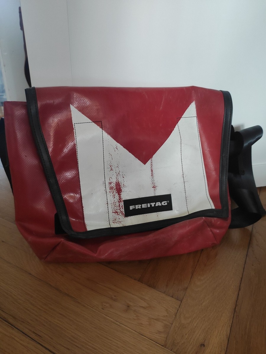 This Freitag Dexter bag combines durability with a unique red and white design. Crafted from upcycled materials, it supports sustainability by giving new life to discarded resources. Lightweight and spacious, it's ideal for daily use or travel. Only used twice and in excellent condition, it offers great value at a reduced price.