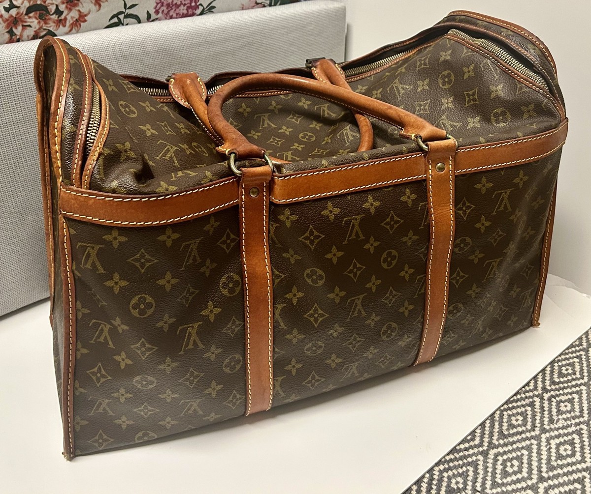 This is an authentic Louis Vuitton Sac Chien 40 pet carrier, crafted in classic Monogram canvas with natural Vachetta leather trim. It was made in Paris in 1984, as confirmed by the embossed date code and heat-stamp. This model is highly collectible and no longer in production.