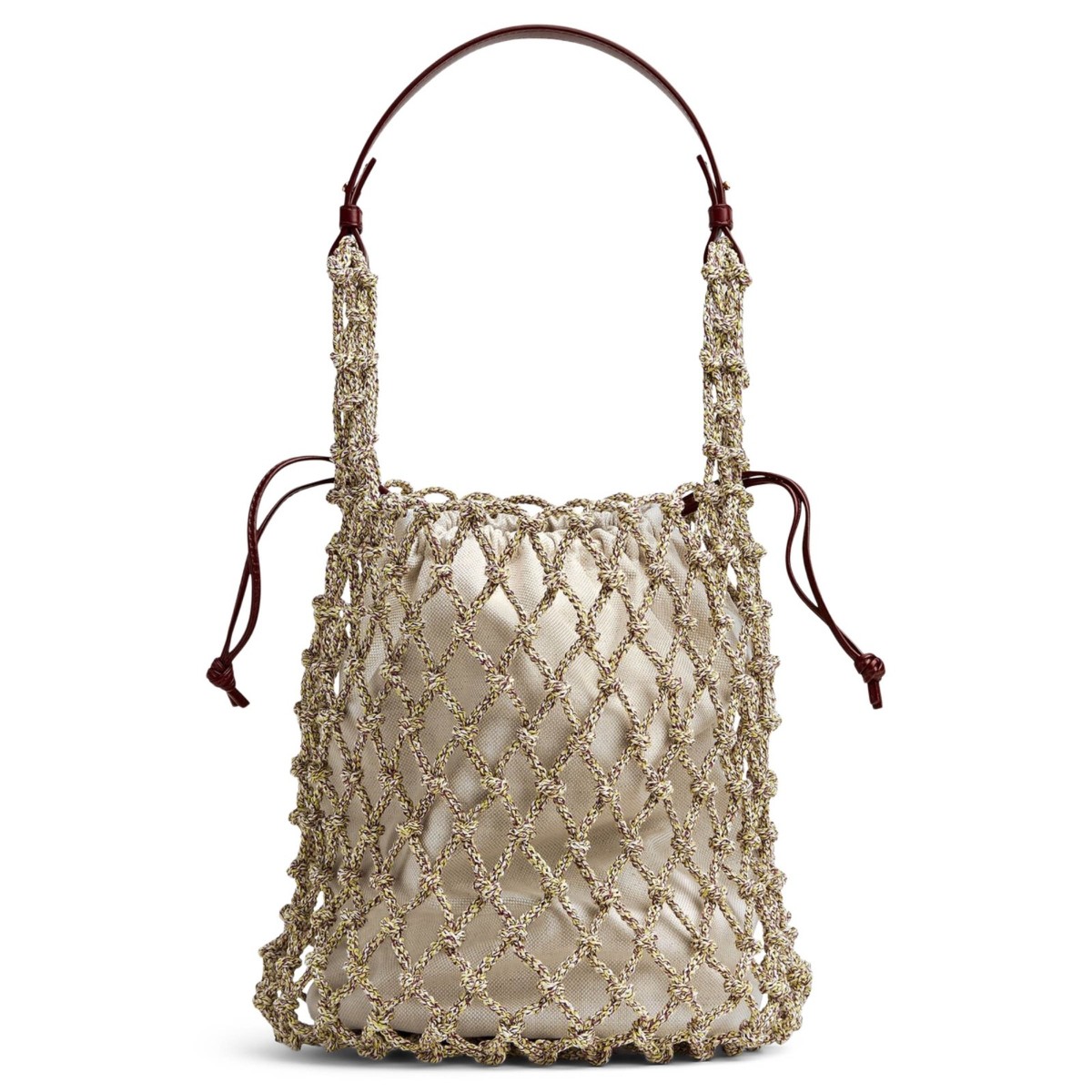 Bottega Veneta Salina bag features a macramé net in yellow, white, and burgundy rope with a sleek burgundy calfskin leather handle. The design is completed with a drawstring canvas pouch insert, offering a perfect balance of artisanal craftsmanship and functional elegance. A distinctive accessory that elevates any warm-weather look. Has been carried once and is in virtually new condition. Comes with dust bag. 2024 Spring/SummerMeasurementsModel796633 V4IO1 6116Height33cm (12.9in)Width16cm (6.2in)Depth13cm (5.1in)Drop of the Handle28cm (10.9in)HardwareGold-ToneAll our listings