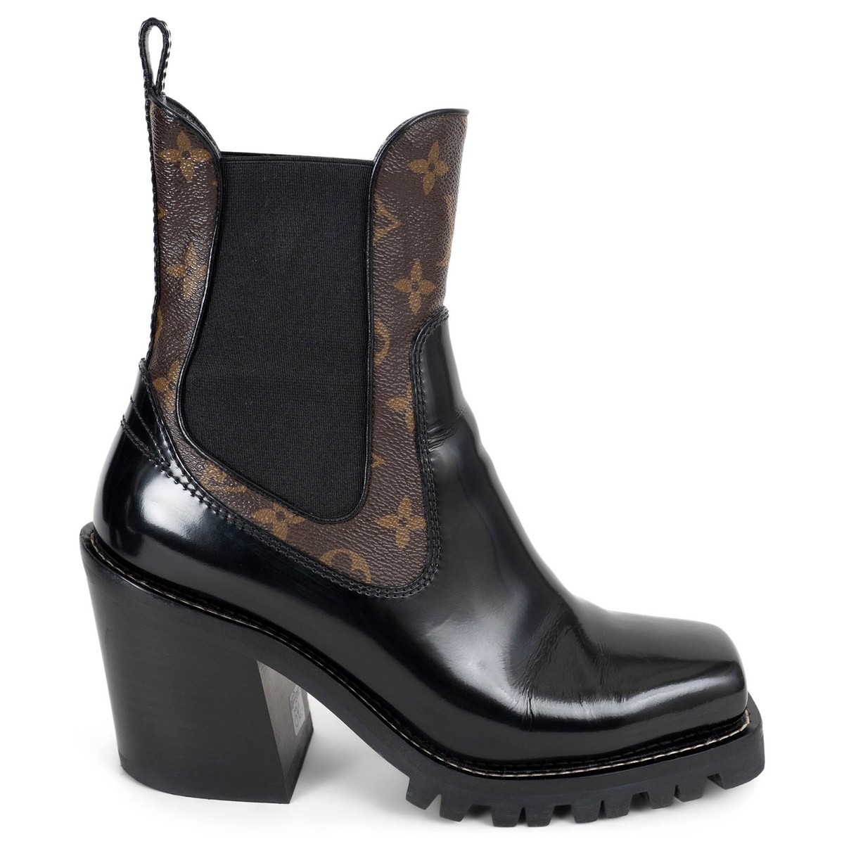 Ankle Boot is crafted from black shiny leather accented with signature Monogram canvas, delivering a bold yet refined aesthetic. Designed with a sturdy stacked heel and a chunky rubber sole, the boot offers both elevated style and everyday comfort. Sleek, modern, and unmistakably Louis Vuitton, this ankle boot is a statement footwear piece that blends luxury craftsmanship with contemporary edge. Have been worn and are in excellent condition.MeasurementsImprinted Size38Shoe Size38Inside Sole25cm (9.8in)Width7.5cm (2.9in)Heel8cm (3.1in)ShopZurich - RämistrasseAll our listings include only the listed item unless otherwise specified in the description above - Price includes US tariffs - for all other countries price does not include import duties & taxes - check your countries import laws prior purchase------------------------------------------------------------------------------------------------------------------------------------------ Terms & Conditions Luxury-Shops is not affiliated with any of the name-brand items we offer for sale.Warranties and Liabilites: Luxury-Shops declines all responsibility and cannot be held liable for any damages caused by the use of a specific garment.We also cannot be held responsible for the quality of an item (we are not the manufacturer) or any damages resulting from a manufacturing defect.No warranties of any kind are given or implied.Condition of Merchandise: Luxury-Shops offers for sale luxury top-quality products. We fully disclose the condition of each item. In the description of each product, Luxury-Shops will specify the conditions if different from the standards set by the market (Required disclosure of prior use)The main characteristics of products are shown in great detail (through numerous photographs and in-depth descriptions). The products offered for sale MAY NOT correspond to the real garments in terms of image and color because of the Internet Browser or Monitor used (color calibration). Luxury-Shops disclaims all responsibility.Every used item offered by Luxury-Shops has been cleaned and restored to the best possible condition unless noted otherwise. Every used or vintage handbag has been polished and refinished. Your purchases will be sent to you ready to be used or worn.Please be aware that vintage items may be delicate and may not be as resilient as a brand-new item. Please take appropriate care when using a vintage item. Damage to items after receipt or use by customers is not the responsibility of Luxury-Shops.Luxury-Shops is a reseller of authentic designer and vintage merchandise. We are not an authorised dealer and are not affiliated with the brands we sell on our site. Store-new designer items are only available from an authorised dealer or the actual store. Once the item leaves the authorised dealer with a customer, the item is considered pre-owned. However, items can be pre-owned and in new condition - that is, never used by the owner. Below are the definitions of the descriptions we use.NEW: in new condition, that is, never used. This means the item may have been purchased by us from an authorized dealer or a store. New items may also be pre-owned, that is, purchased by one of our consignors and never used. These items may have minor signs of handling as would any item available at an authorized dealer or boutique given that customers would reasonably handle an item when trying it on or examining it for purchase.USED: the…