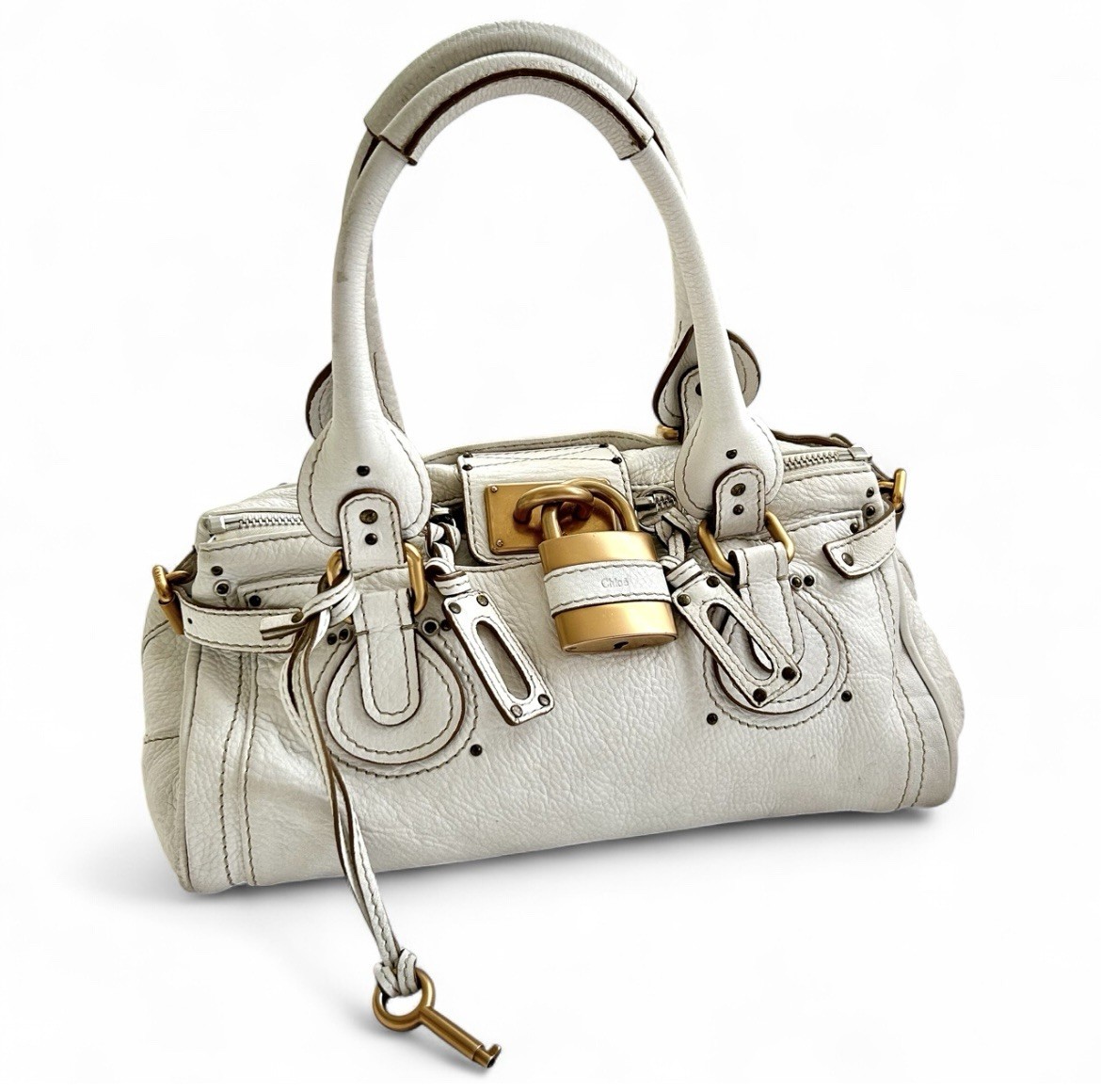 Questa autentica borsa Chloé Paddington unisce uno stile senza tempo a un lusso sostenibile. Realizzata in bellissima pelle bianco sporco/crema, presenta dettagli in metallo dorato e l'iconico lucchetto che ha reso questo design dei primi anni 2000 così memorabile.