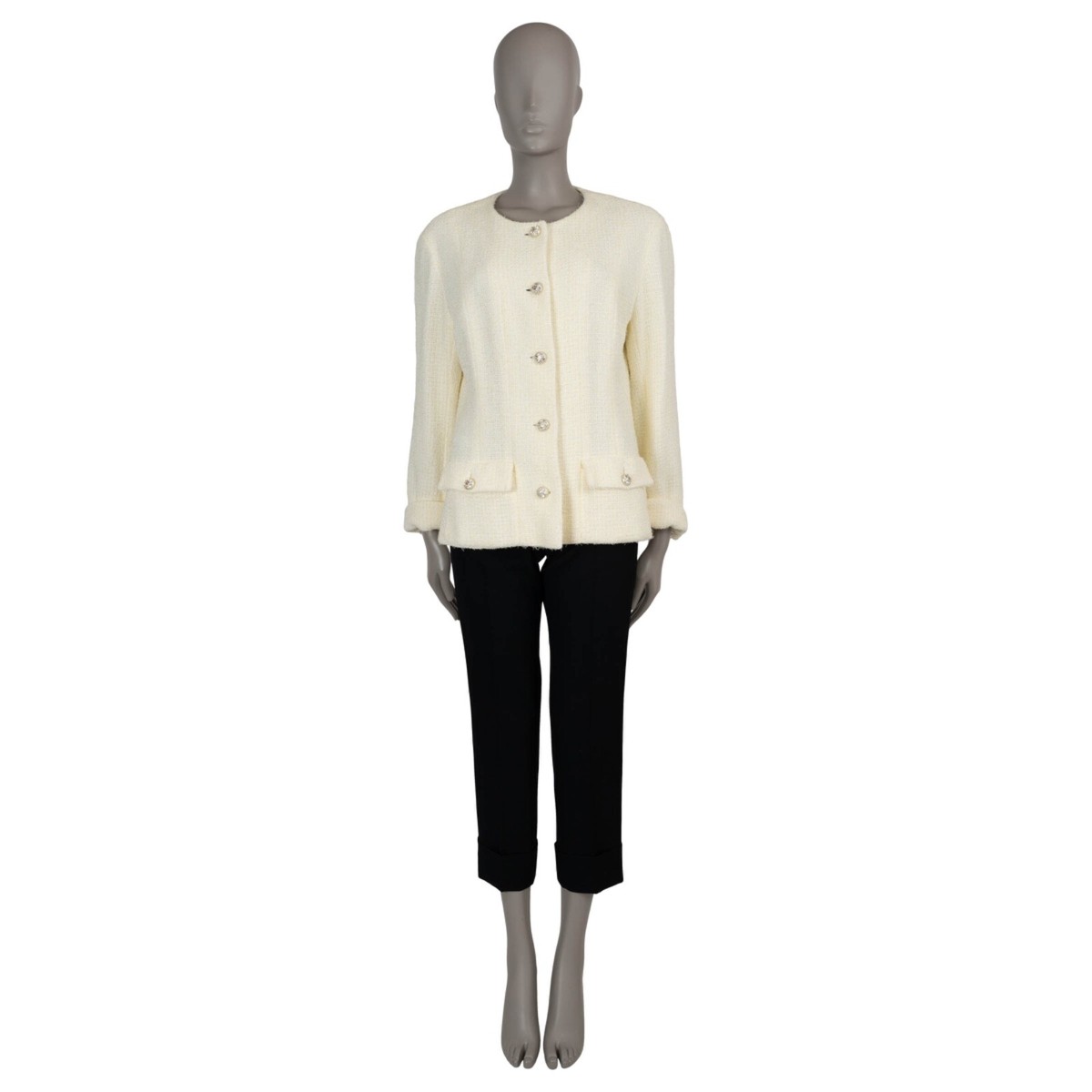 authentic Chanel jacket in yellow and light yellow tweed cotton (62%) and polyamide (38%) is a refined statement piece, blending timeless elegance with modern charm. Designed with a collarless, boxy silhouette and 7/8 sleeves, it features two buttoned flap pockets and folded buttoned cuffs for a sophisticated finish. The jacket closes with crystal-embellished pearlescent CC buttons on the front, adding a touch of iconic Chanel luxury. Lined in silk (100%), this piece is an effortlessly chic addition to any wardrobe. Has been worn and is in excellent condition with no obvious sings of wear. 2023 Spring/SummerMeasurementsModel23S P74764 V66453 NN201Tag Size46 (fits L)SizeLShoulder Width47cm (18.3in)Bust From107cm (41.7in)Waist From98cm (38.2in)Hips From112cm (43.7in)Length65cm (25.4in)Side Seam Length36cm (14in)Sleeve Length53cm (20.7in)All our listings