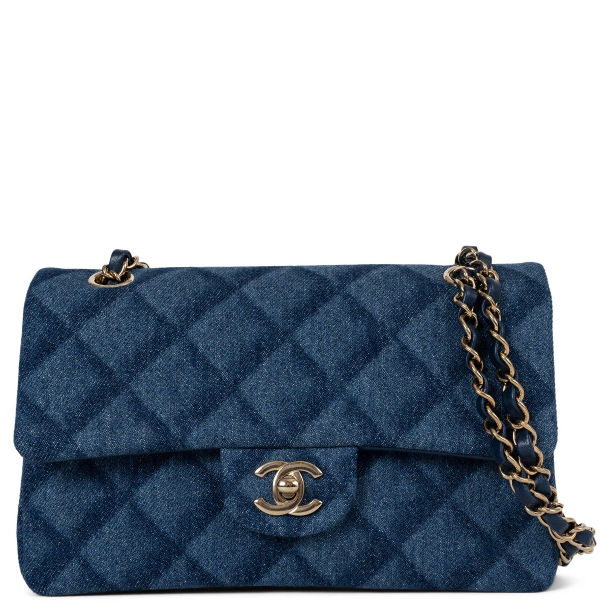 M/L Double Flap shoulder bag in dark blue printed denim with a quilted optic offers a unique twist on the iconic silhouette. Featuring gold-plated hardware, an interwoven chain strap, and an open pocket on the outside back, it balances elegance with modern edge. The CC turn-lock opens to a leather-lined interior with a love letter zip pocket in the flap, an open pocket on the front, and a main compartment equipped with two open pockets and a lipstick pocket against the back. A standout piece for any collection. Has been carried and shows