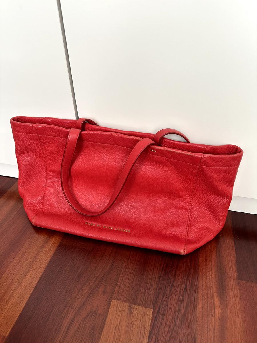 This chic Marc by Marc Jacobs red leather tote bag is the perfect everyday companion. With its spacious interior and comfortable shoulder straps, it offers practicality and style for any occasion. The bag is made from luxurious pebbled leather and features gold-tone hardware. The interior is lined with signature Marc Jacobs fabric, including a zip pocket for secure storage. While there are visible signs of wear on the exterior corners, it doesn't detract from the overall stylish look. This bag still has a lot of life left and would make a great addition to your collection!